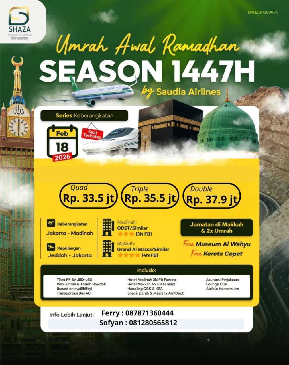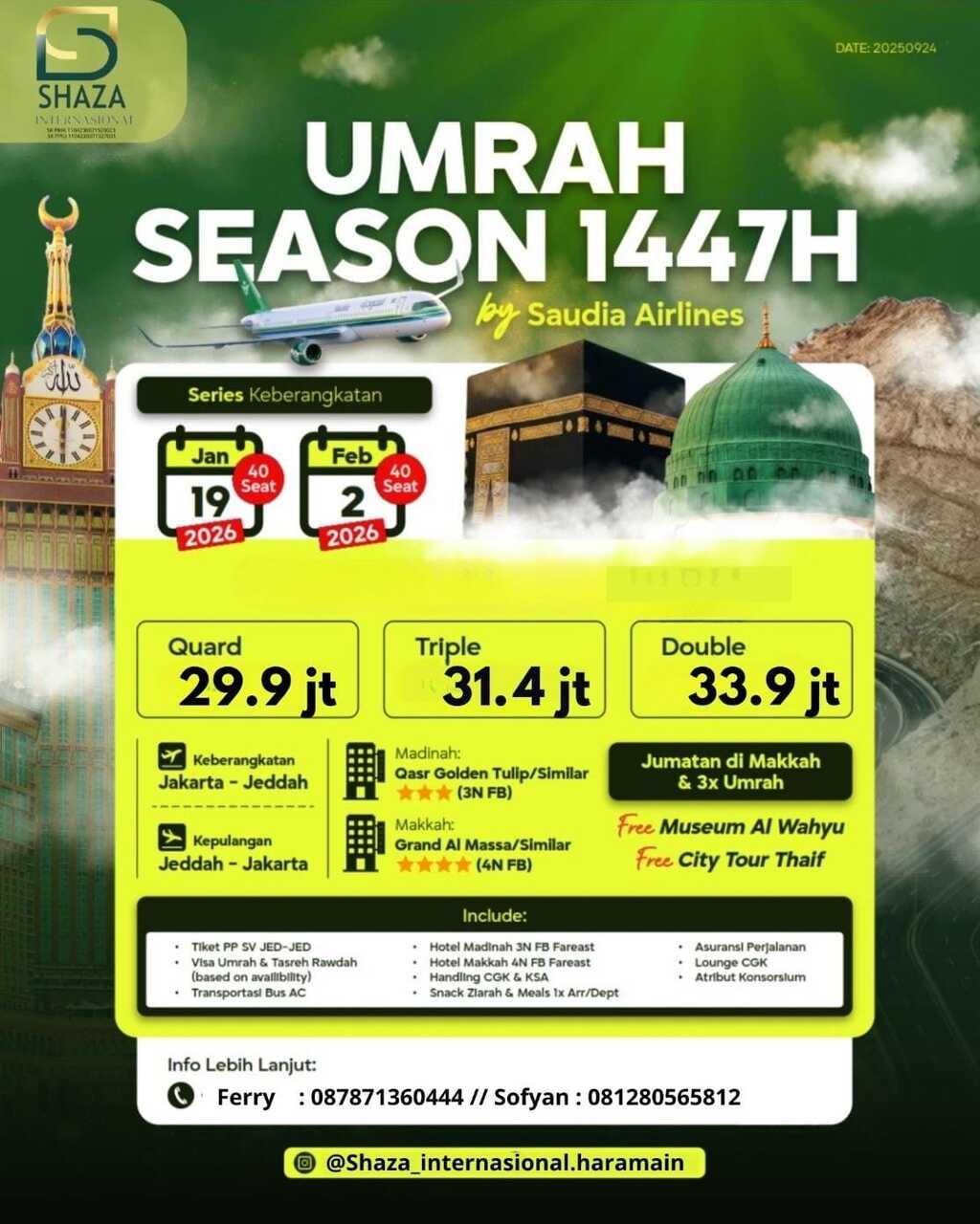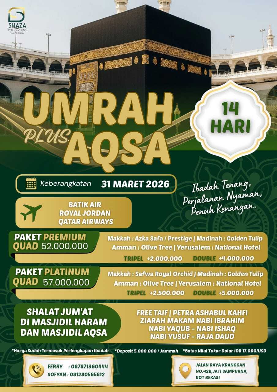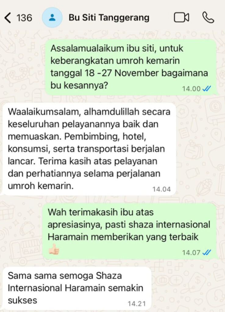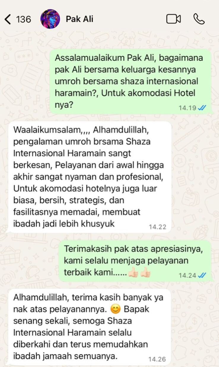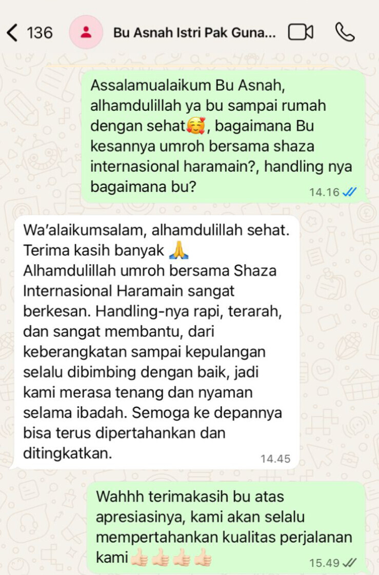Shaza Internasional memberikan pengalaman umroh yang luar biasa! Sejak dari awal hingga akhir perjalanan, semua berjalan lancar.